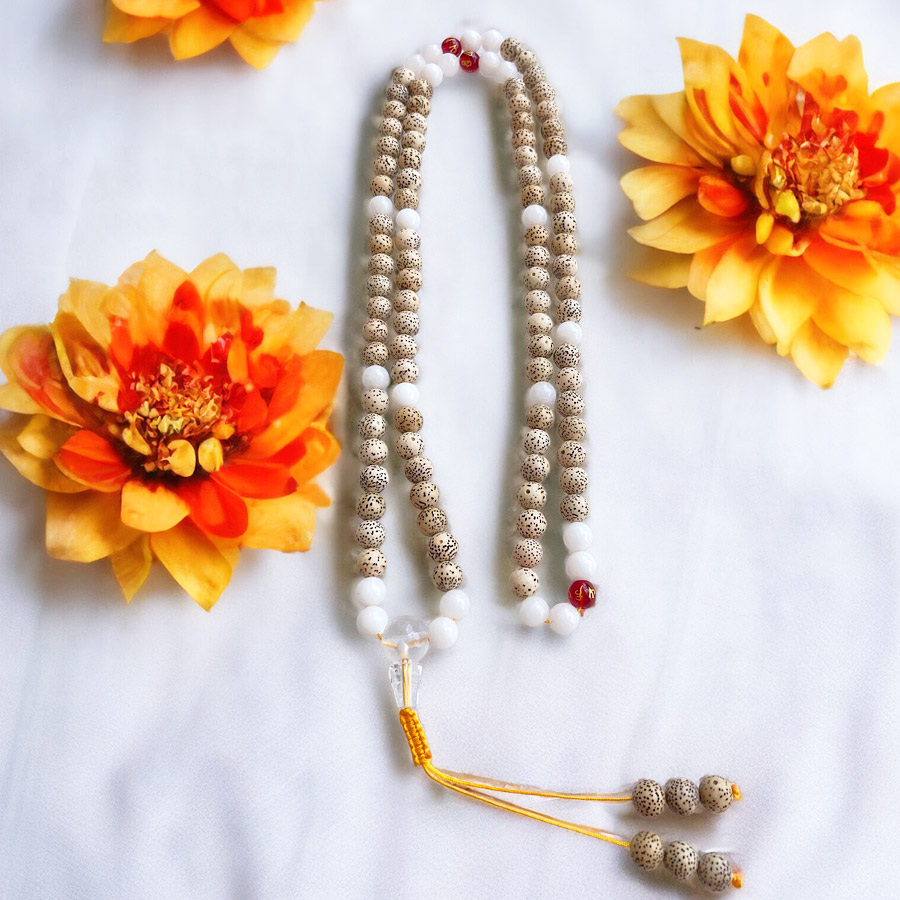108 szemes valódi lótusz magokból készült lótusz mala, fehér jáde és Om Mani Padme Hum mantrás osztókkal. Normál 8 mm-es a szemek mérete. Csúszócsomós kialakítás, így állítható a szemek távolsága.