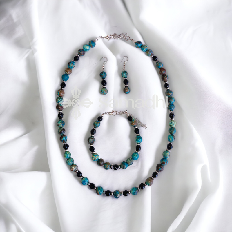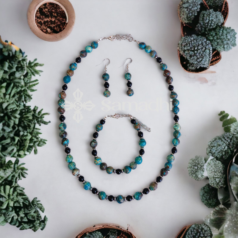 A Blue Magic Szett egy lenyűgöző ékszerkollekció, amelyet a Samadhi tervezett és készített. A szett szivárvány jáspis és ónix ásványokat tartalmaz, amelyek elegáns és kifinomult megjelenést kölcsönöznek a viselőjüknek.