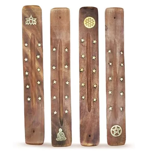 Klasszikus, fából készült füstölőégető léc, bronz szimbólumos betéttel. A megvásárolt termék 1 lécet tartalmaz, és a képen látható mintázatok közül véletlenszerűen kerül kiválasztásra.