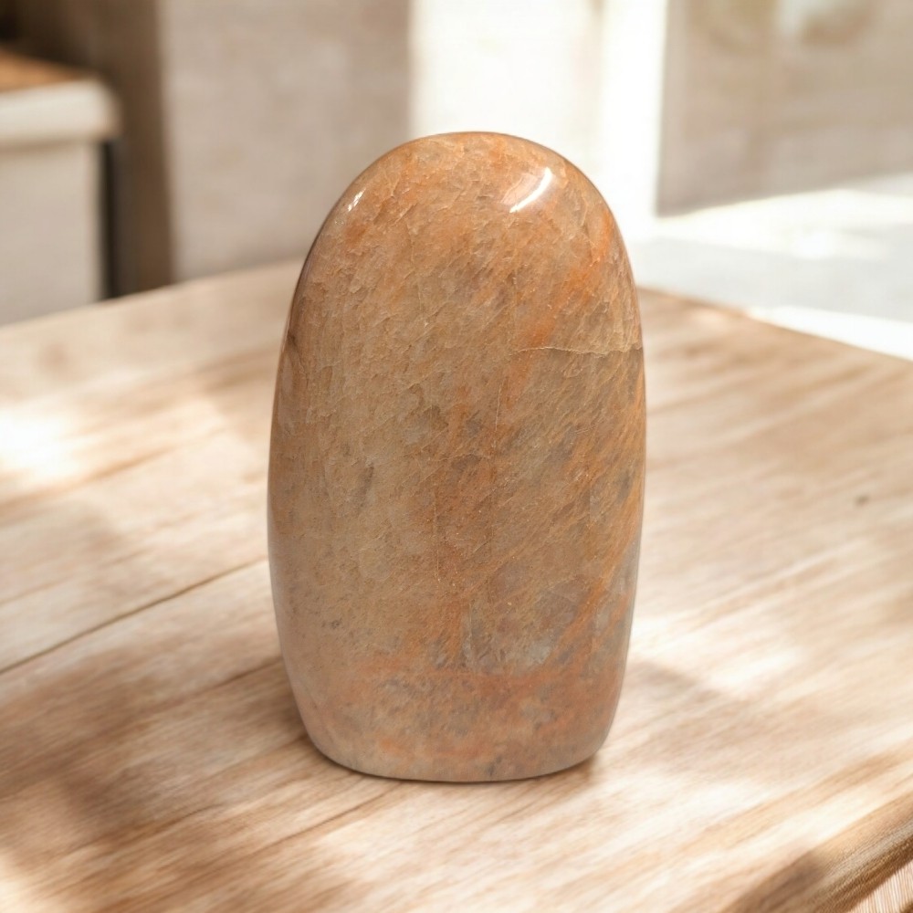 Ez a holdkő állókő letisztult, elegáns megjelenésével azok közé a darabok közé tartozik, amelyek nem az erős kontrasztokkal, hanem a finom részletekkel hatnak. A 11 cm-es magasság és a 434 grammos tömeg ideális arányt ad: elég masszív ahhoz, hogy stabilan álljon, mégis könnyed marad az összhatás. A felület selymesen polírozott, enyhén ívelt formája pedig szinte „szoborszerűvé” teszi.