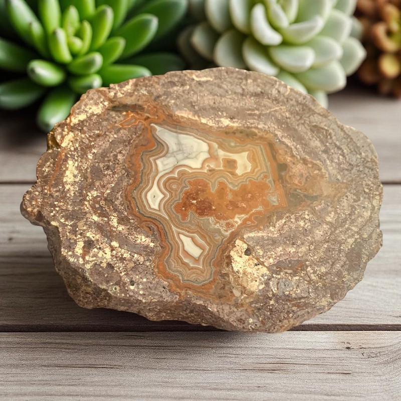 Ez a 11,5 cm-es, közel 600 grammos sávos jáspis szelet egyfajta geológiai mandala – a természet precíz és türelmes munkája. A belső rétegek hullámzó, térképszerű mintázata évszázezredek nyomát hordozza, miközben a külső, nyers perem emlékeztet a kő eredeti formájára. Ez a kettősség – a rendezettség és a vadság – különleges energetikai összhangot hoz létre.