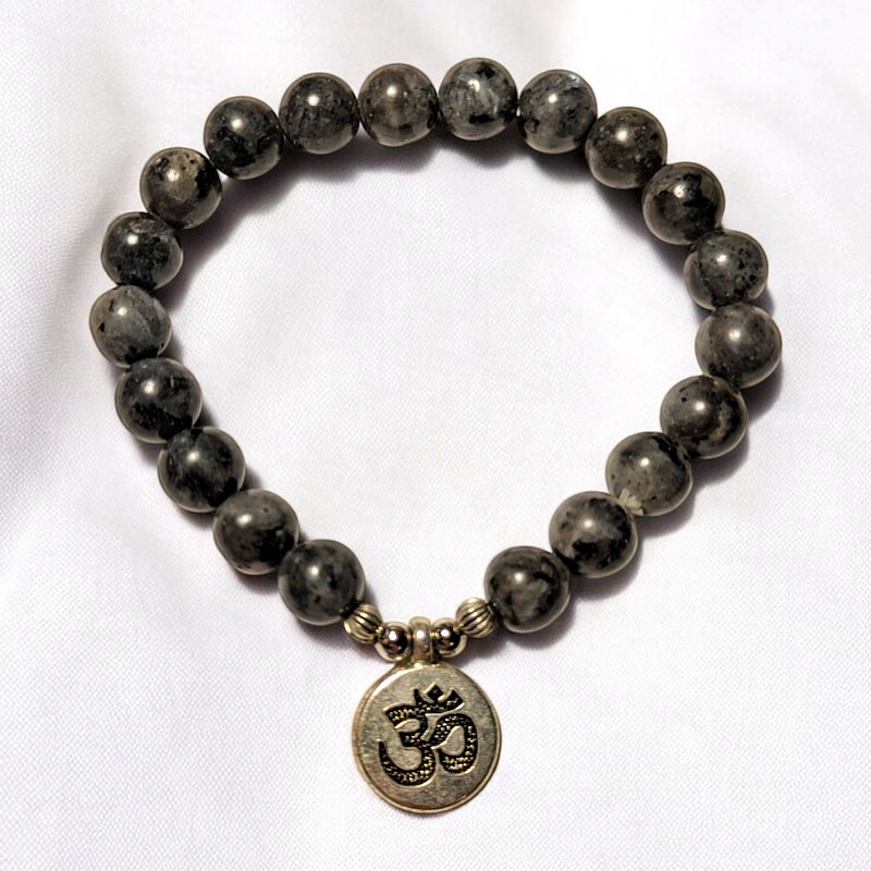 Larvikit ásványkarkötő Om szimbólumos medállal.