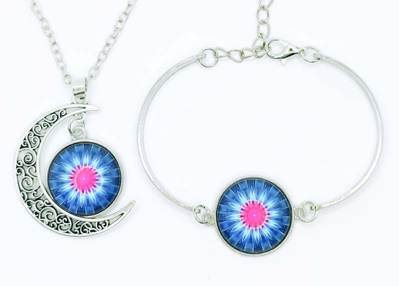 Mandala ékszer szett 2 részes, nyaklánc és karkötő, üveg mandala függőkkel. Mindkettő állítható méretű.