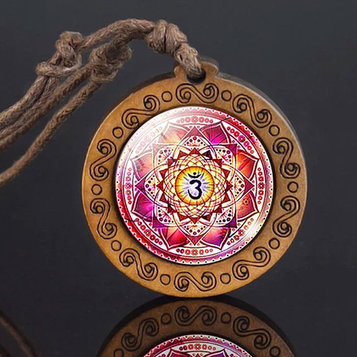 A nyaklánc függője egy üveg medál, aminek a foglalata fából készült. A medál teljes átmérője: 4 cm.