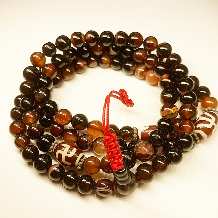 Ónix+achát 108 szemes nepáli mala, 8 mm-es szemekkel. Állítható méretű. Az osztók ásványai a szvasztika ősi szimbólumával vannak díszítve (NEM horogkereszt).