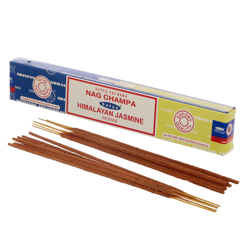 Különleges kiadású füstölő: a klasszikus Satya Nag Champa és a Satya Himalayan Jasmine füstölőkből fele-fele arányban tartalmaz szálakat.