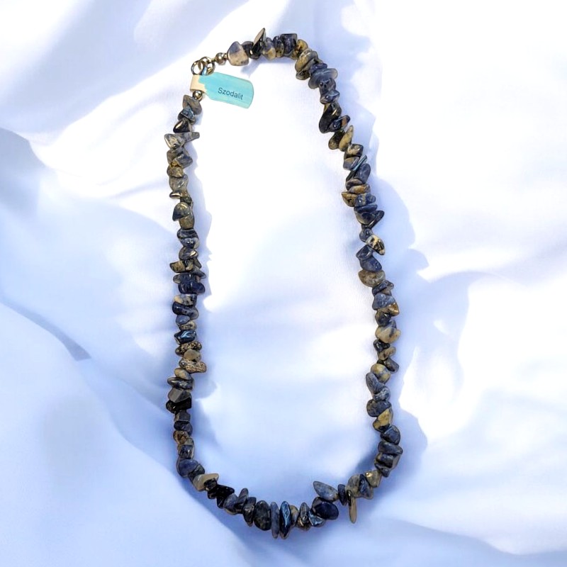 Szodalit apróköves ásvány nyaklánc, kapoccsal ellátva.