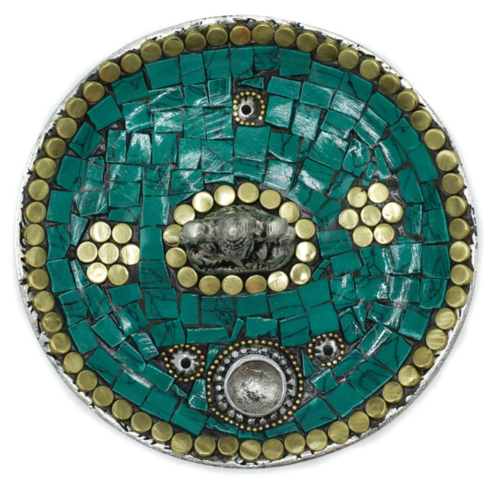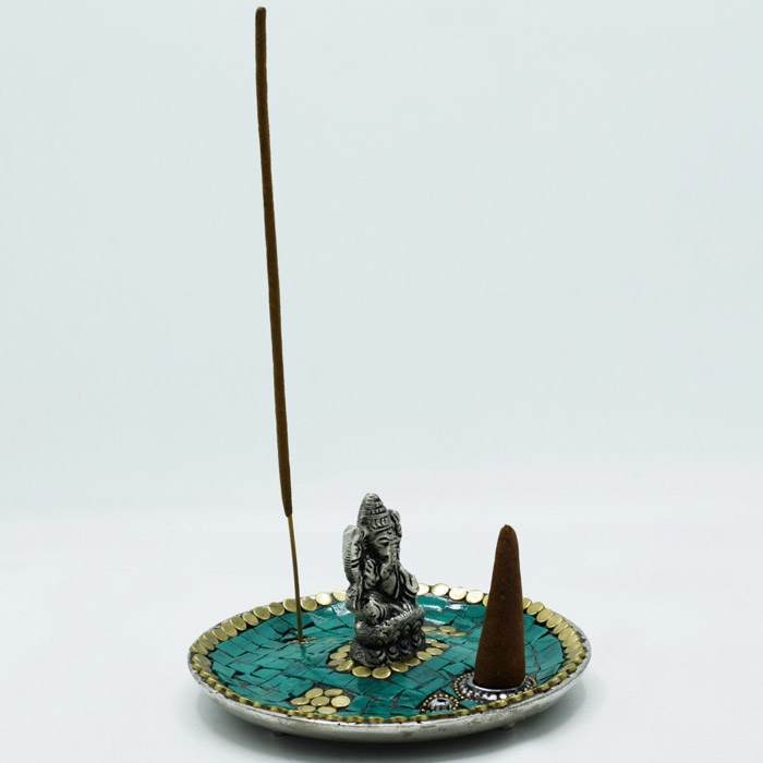 Gyönyörűen kimunkált tibeti stílusú fém füstölőégető tál, alkalmas szálas és kúpfüstölők égetésére. A közepét egy Ganésa szobrocska díszíti.