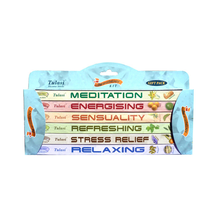 Különleges aromaterápiás ajándékcsomag összeállítás 6 doboz különböző Tulasi füstölővel. Összesen 6×8 szál füstölőt tartalmaz a csomag.